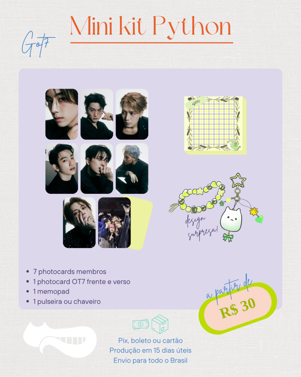 Estamos incrementando o catálogo da loja e com isso, trazemos para vocês os mini kits do GOT7! Tem algum comeback deles que você quer ver por aqui e levar pra casa além desse? Avisa nos comentários!